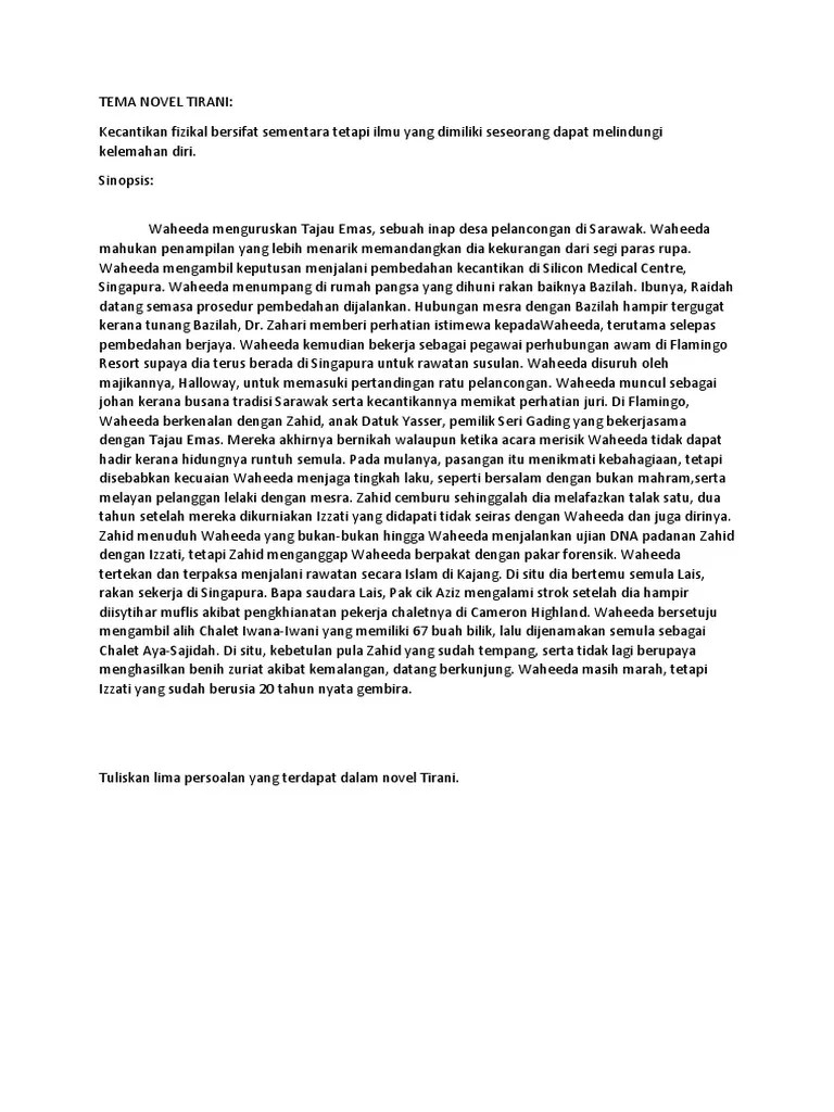 Dalam novel tirani cinta waheeda terhadap suaminya begitu mendalam. Waheeda berasa gembira kerana kedatangan para pelancong.namun,waheeda juga berasa kecewa atas penampilan dirinya yang tidak cantik.dia pun berhajat untuk . You have just read the article entitled peristiwa penting novel tirani. Dalam novel tirani cinta waheeda terhadap suaminya begitu mendalam. L peristiwa dalam novel tirani yang boleh dijadikan teladan dan alasan 1 from. Lima peristiwa penting novel tirani bab 5 6 7 dan 8 novel tirani tingkatan 5.